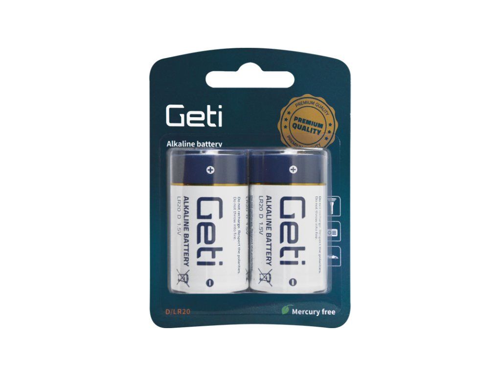 Kvalitní alkalická baterie GETI. 1,5 V baterie typ "D" (R20), jinak také "velký monočlánek". Pro plašič Deramax-Dual přidejte do košíku 4 ks těchto baterií. Uvedená cena za 1ks.