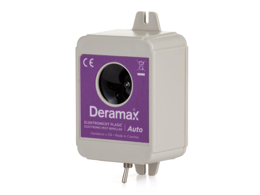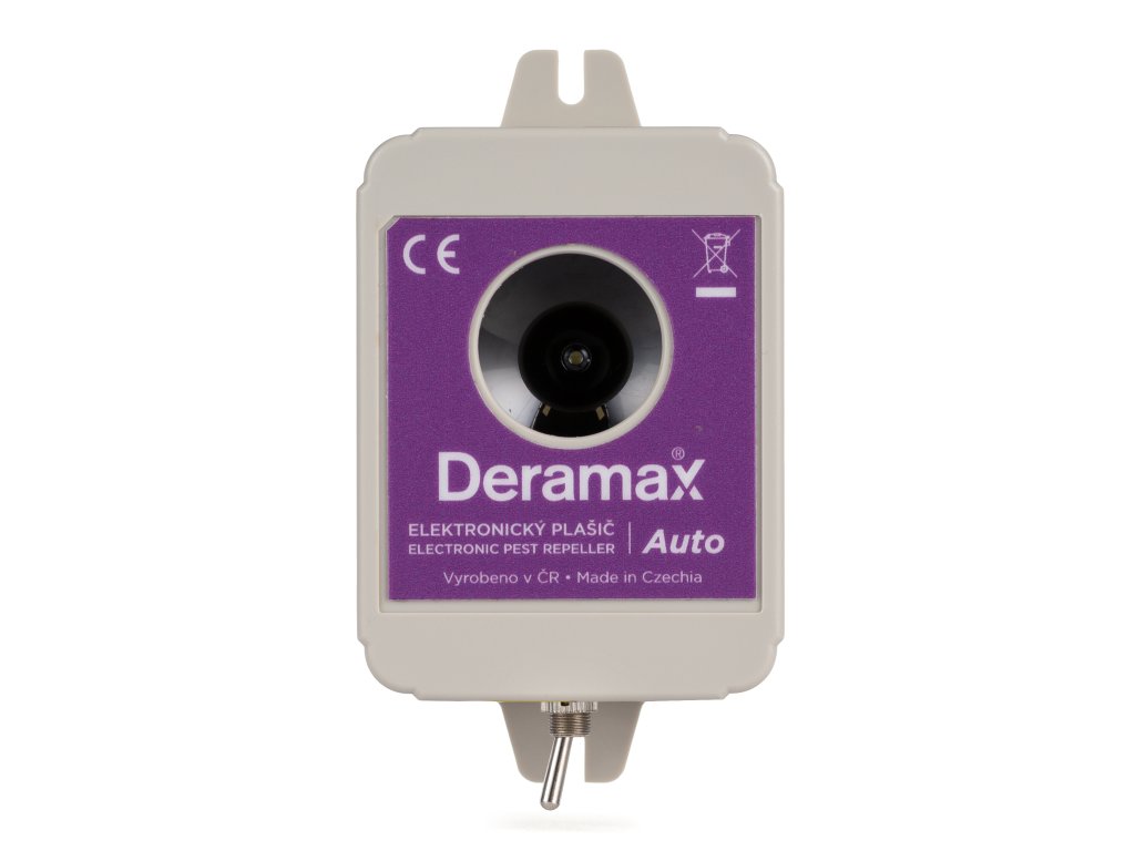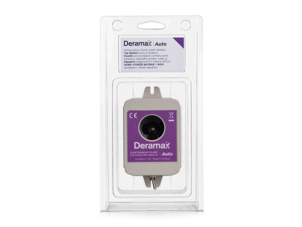 Deramax-Auto je z hlediska využití velmi univerzální bateriový plašič kun a hlodavců určený pro ochranu jak budov a jejich okolí, tak i automobilů. Pomáhá řešit problémy, které ve vozidlech na kabeláži, polstrech apod. způsobují kuny a myši. Přístroj je běžně využívaný také pro ochranu zemědělských strojů, karavanů, lodí apod. Plašič Deramax-Auto generuje silné ultrazvukové pulzy specifického tvaru, které jsou pro kuny a hlodavce velmi nepříjemné, takže po krátkém čase chráněný prostor opouští. Provoz přístroje je ekologický bez využití chemických prostředků.