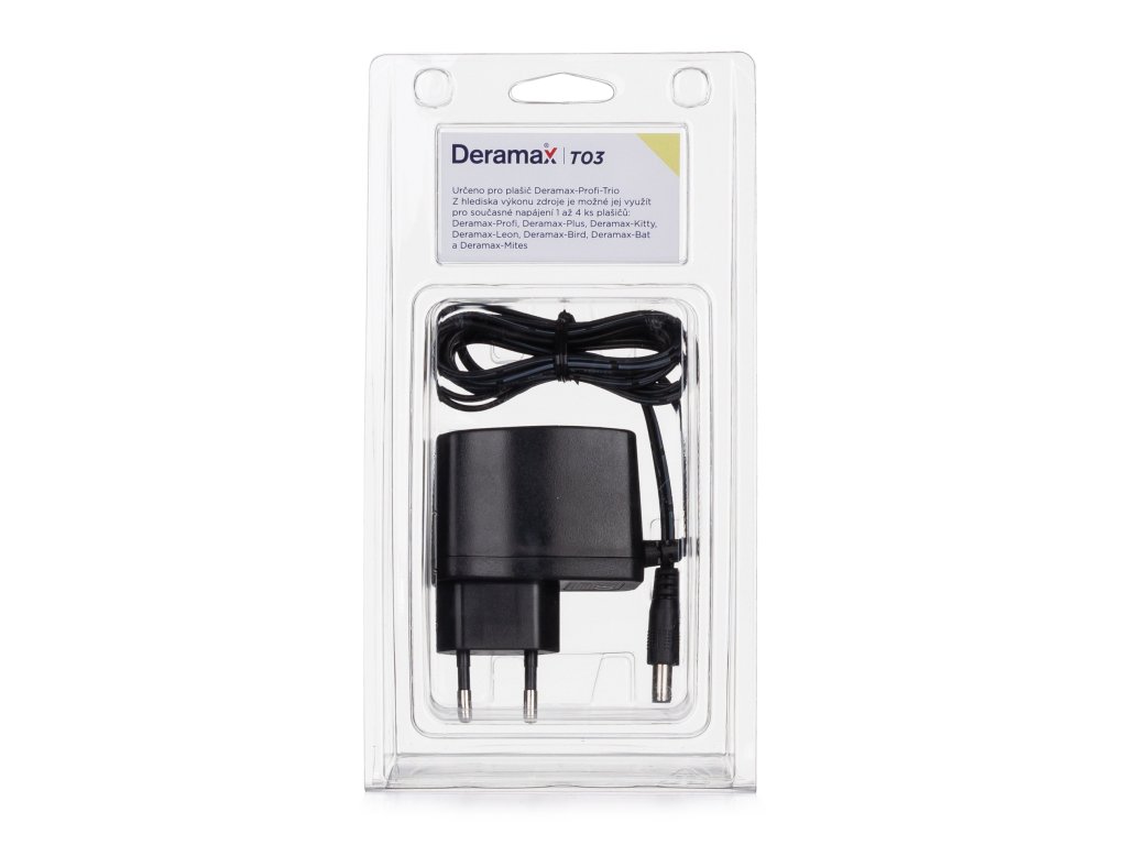 Kvalitní stabilizovaný síťový napájecí zdroj. Tento síťový zdroj je určen pro napájení plašičů Deramax-Profi, Deramax-Kitty, Deramax-Bird a Deramax-Bat.