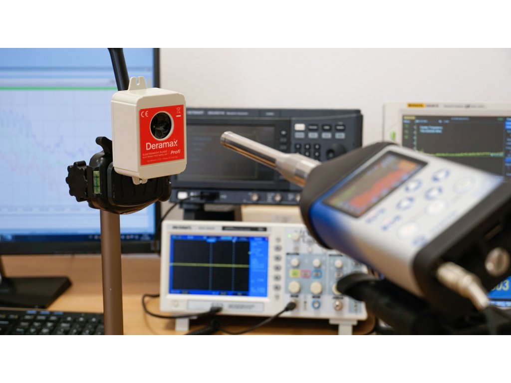 Hladina akustického tlaku plašiče Deramax-Profi: 106 dB/30,5 cm, 96 dB/1 m. Hodnoty LAmax. Efektivní (TrueRMS) hodnoty hladiny akustického tlaku. Měření bylo řešeno v rámci zkušebny TÜV SÜD.